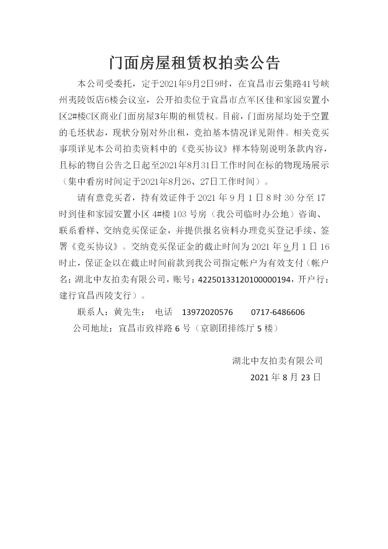 (通訊員周琴、彭曉燕)點軍區(qū)佳和家園安置小區(qū)2#樓C區(qū)商業(yè)門面房屋是點軍區(qū)國資局授權(quán)宜昌點盛投資開發(fā)有限公司經(jīng)營管理的安置房商業(yè)資產(chǎn),目前該項目正在開展租賃權(quán)競拍工作,競拍公告已發(fā)布點軍區(qū)人民政府網(wǎng),現(xiàn)將公告內(nèi)容公布如下: