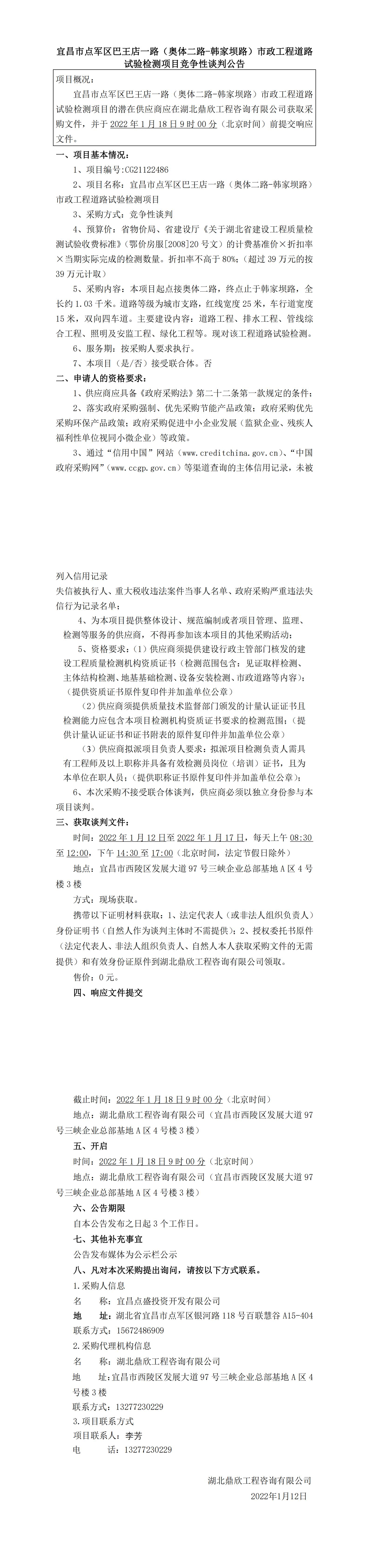 宜昌市點(diǎn)軍區(qū)巴王店一路(奧體二路-韓家壩路)市政工程道路試驗(yàn)檢測項(xiàng)目競爭性談判公告