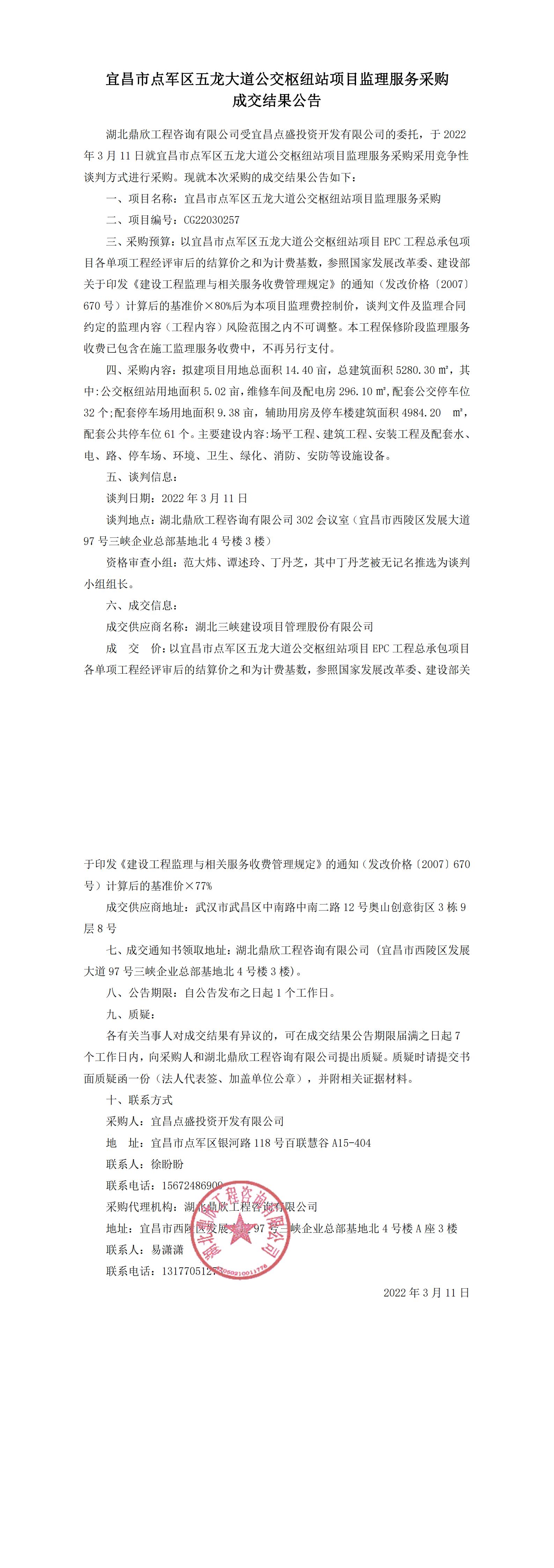 宜昌市點軍區(qū)五龍大道公交樞紐站項目監(jiān)理服務采購成交結果公告