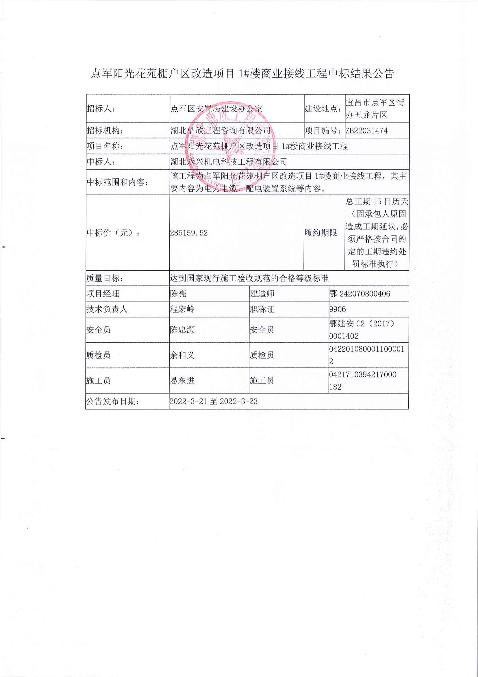 點軍陽光花苑棚戶區(qū)改造項目1#樓商業(yè)接線工程中標公告