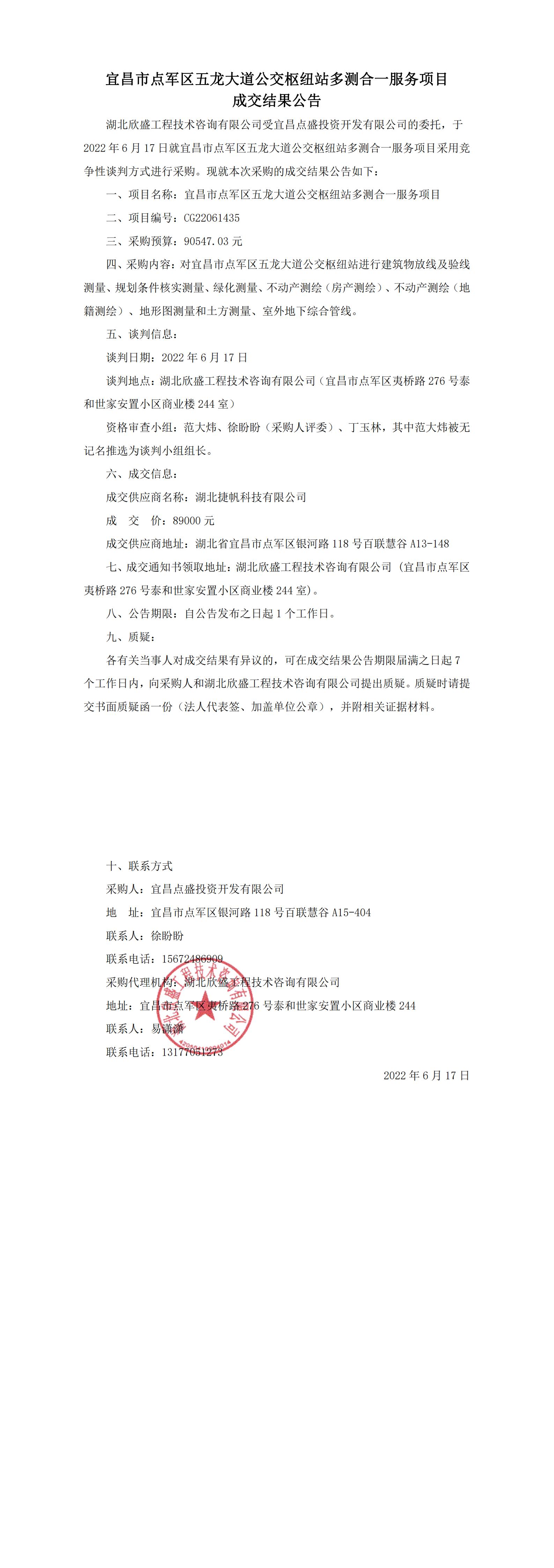 宜昌市點軍區(qū)五龍大道公交樞紐站多測合一服務項目成交結(jié)果公告