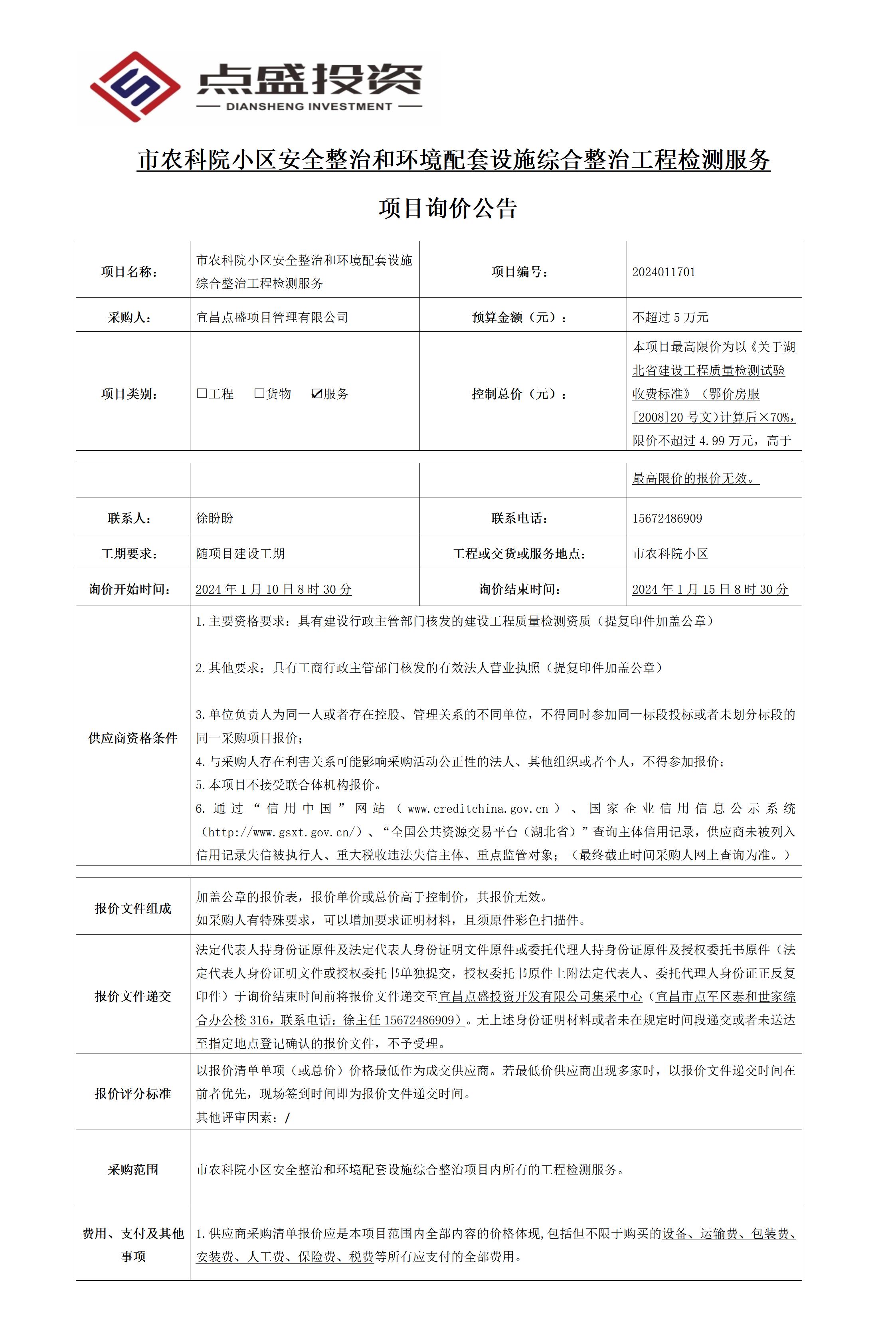 市農(nóng)科院小區(qū)安全整治和環(huán)境配套設(shè)施綜合整治工程檢測服務(wù) 項目詢價公告