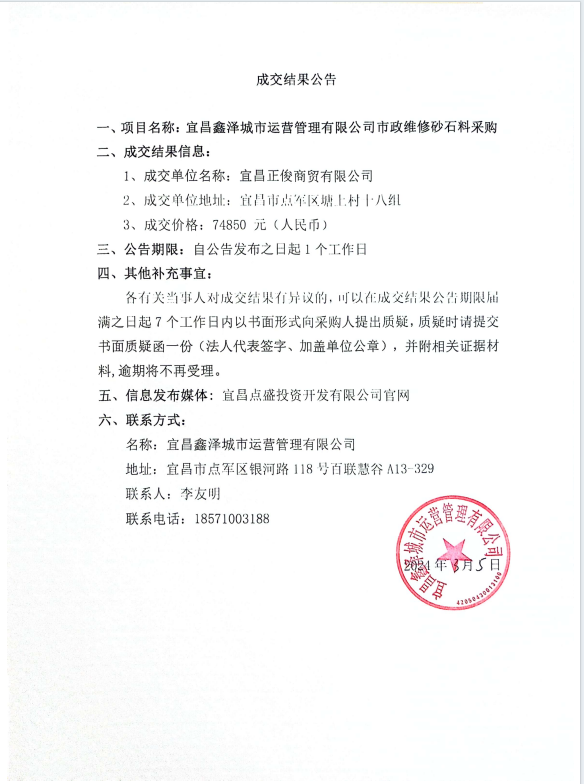 宜昌鑫澤城市運營管理有限公司市政維修砂石料采購項目成交公告
