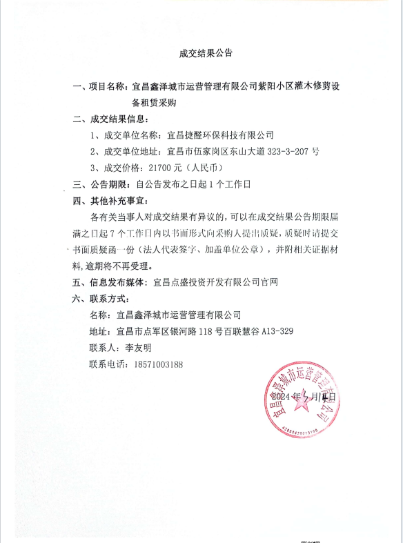 宜昌鑫澤城市運(yùn)營(yíng)管理有限公司管紫陽小區(qū)灌木修剪設(shè)備租賃采購項(xiàng)目成交公告