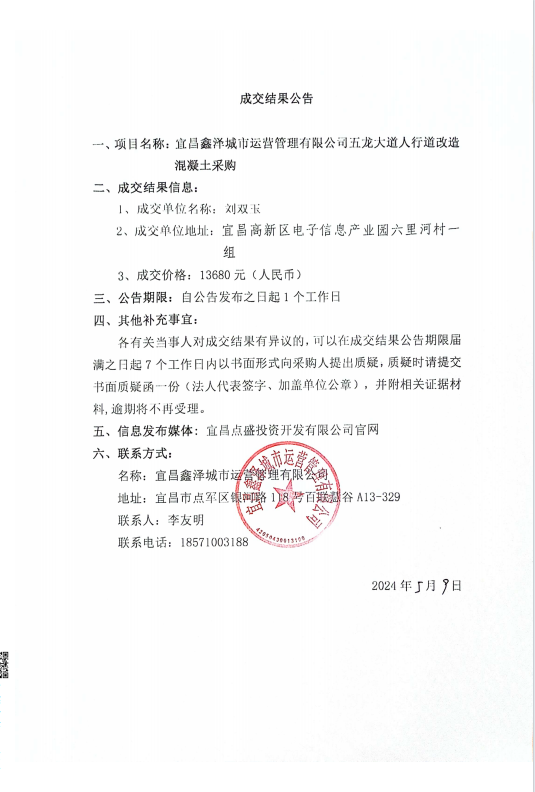 五龍大道人行道改造混凝土采購項(xiàng)目成交公告