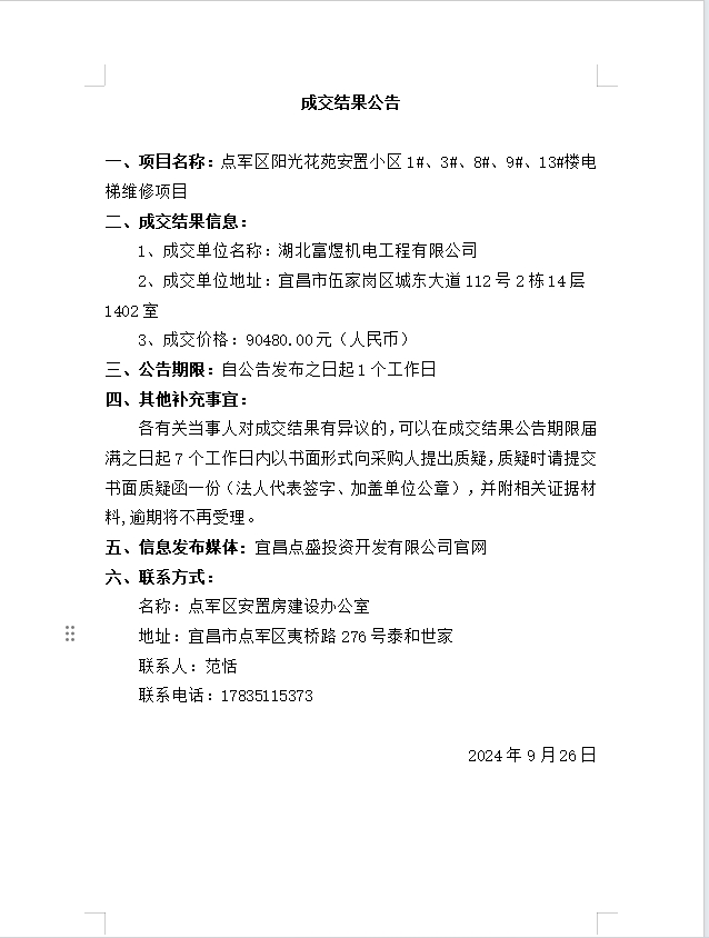 點軍區(qū)陽光花苑安置小區(qū)1#、3#、8#、9#、13#樓電梯維修項目成交公告