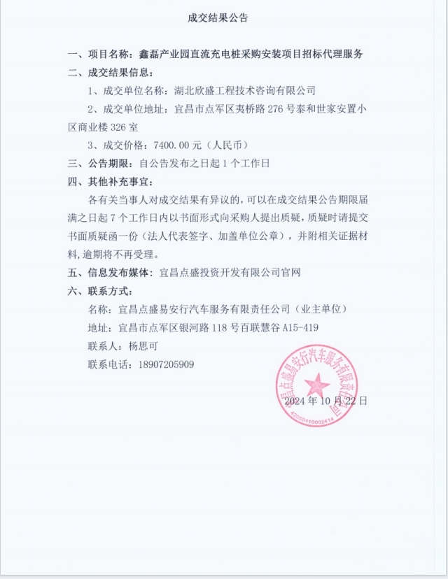 鑫磊產(chǎn)業(yè)園直流充電樁采購(gòu)安裝項(xiàng)目招標(biāo)代理服務(wù)成交公告