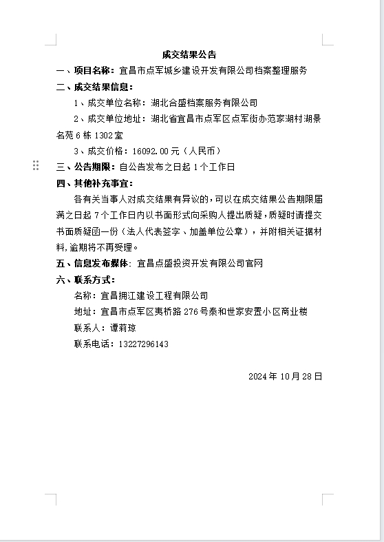 宜昌市點(diǎn)軍城鄉(xiāng)建設(shè)開(kāi)發(fā)有限公司檔案整理服務(wù)成交公告