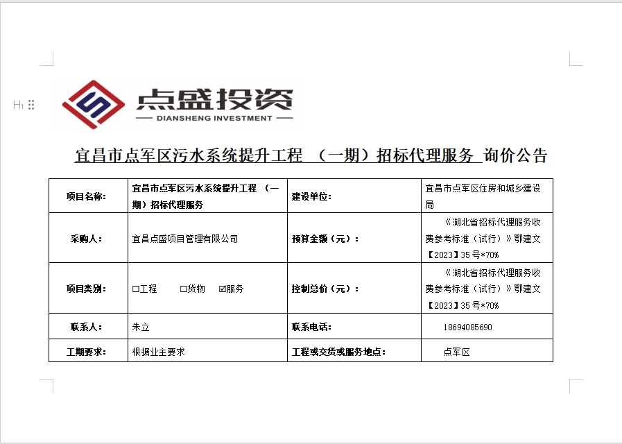 宜昌市點(diǎn)軍區(qū)污水系統(tǒng)提升工程 (一期)招標(biāo)代理服務(wù)詢價(jià)公告