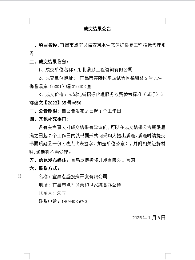 宜昌市點(diǎn)軍區(qū)福安河水生態(tài)保護(hù)修復(fù)工程招標(biāo)代理服務(wù)成交公告