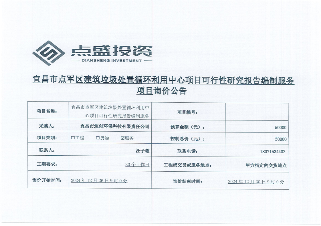 宜昌市點(diǎn)軍區(qū)建筑垃圾處置循環(huán)利用中心項(xiàng)目可行性研究報(bào)告編制服務(wù)項(xiàng)目詢價(jià)公告