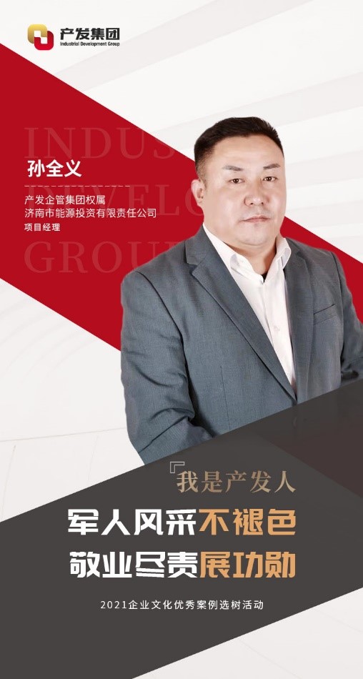 孫全義,現(xiàn)任產(chǎn)發(fā)企管集團權(quán)屬濟南市能源投資有限責(zé)任公司(以下簡稱“能投公司”)項目經(jīng)理。2001年參軍,在部隊期間刻苦訓(xùn)練,聽黨指揮,服從命令。2003年他從部隊光榮退役,隨后加入能投公司。期間曾借調(diào)至濟南市發(fā)改委幫助工作,現(xiàn)負(fù)責(zé)能投公司的資產(chǎn)管理工作。