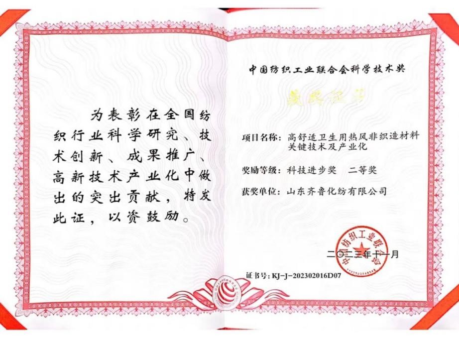 12月6日上午,2023年度中國紡織工業(yè)聯(lián)合會(huì)科學(xué)技術(shù)獎(jiǎng)勵(lì)大會(huì)在北京人民大會(huì)堂隆重召開。齊魯化纖集團(tuán)山東齊魯化紡有限公司與天津工業(yè)大學(xué)產(chǎn)學(xué)研團(tuán)隊(duì)共同開發(fā)的“高舒適衛(wèi)生用熱風(fēng)非織造材料關(guān)鍵技術(shù)及產(chǎn)業(yè)化”項(xiàng)目榮獲2023年度中國紡織工業(yè)聯(lián)合會(huì)科技進(jìn)步獎(jiǎng)二等獎(jiǎng),化紡公司副總經(jīng)理唐元冰代表公司上臺(tái)接受表彰。
