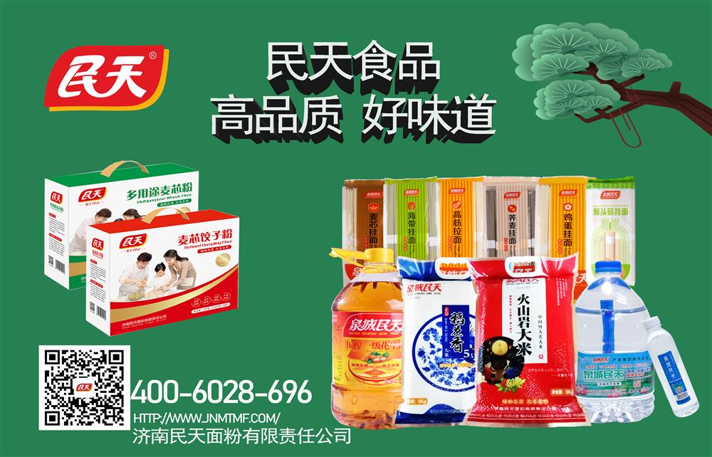 濟(jì)南民天面粉有限公司是隸屬于濟(jì)南產(chǎn)發(fā)集團(tuán)的三級全資公司,在濟(jì)南已有56年歷史,現(xiàn)在承擔(dān)濟(jì)南市應(yīng)急面粉儲備與配送任務(wù),已獲得山東老字號,中國名牌,中國馳名商標(biāo),國家農(nóng)業(yè)產(chǎn)業(yè)化重點龍頭企業(yè),糧食行業(yè)功勛企業(yè),濟(jì)南市區(qū)域農(nóng)產(chǎn)品品牌“泉水人家”授權(quán)使用企業(yè)?,F(xiàn)在面臨由單一等級面粉原料企業(yè)向食品深加工產(chǎn)業(yè)轉(zhuǎn)型的歷史節(jié)點。產(chǎn)品升級:等級面粉向?qū)S妹娣凵?,面粉向深加工特色掛面、速凍濕面胚,速凍米面食品、烘培食品、速食蛋白沖調(diào)品、調(diào)味品、高鍶弱堿性山泉水、高端火山巖大米、稻花香五號大米,東北長粒香大米,月子小米、黃金小米、水餃粉,水餃調(diào)味料,水餃醋,水餃醬油,廚房專用水,保濕噴霧化妝離子水。